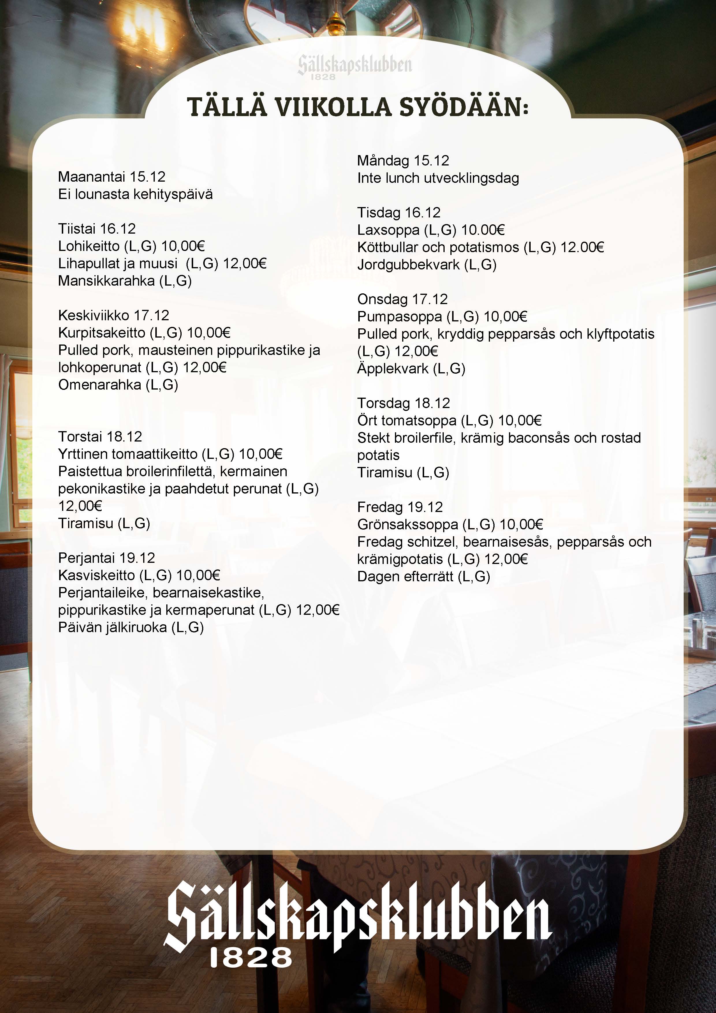 Meillä voi syödä paikan päällä tai tilata lounas ruoat valmiiksi s.postilla: ravintola.sallskapsklubben@gmail.com tai soittamalla 0408236552